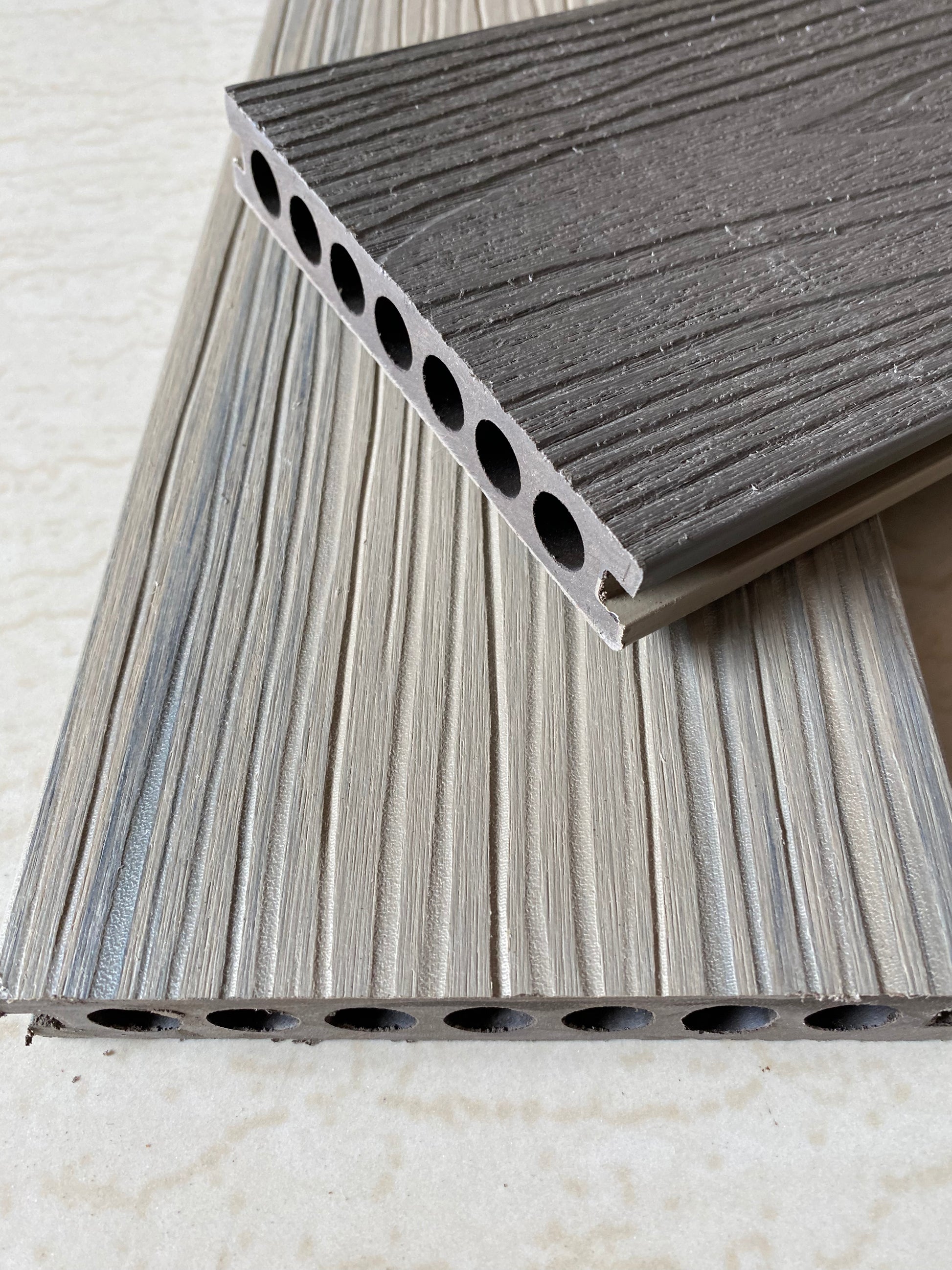 Nuestros pisos Deck Coextruido están fabricados en WPC (Wood Plastic Composite), un material compuesto que combina fibras de madera natural con polímeros plásticos reciclados. Además, estos decks cuentan con una capa coextruida, que añade una protección adicional y mejora su durabilidad y resistencia.